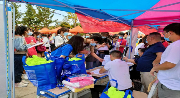上图为:计财处现场收费服务站为新生办理手续的情景,