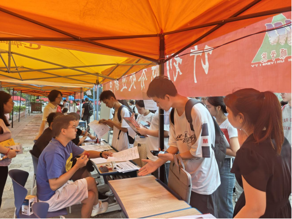 上图为:计财处现场收费服务站为新生办理手续的情景。